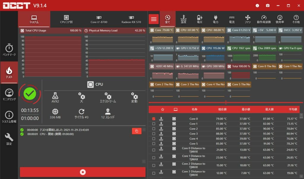 OCCTの結果、約120Wで、最大93℃とすれすれまで行きましたが、サーマルスロットはおきませんでした。